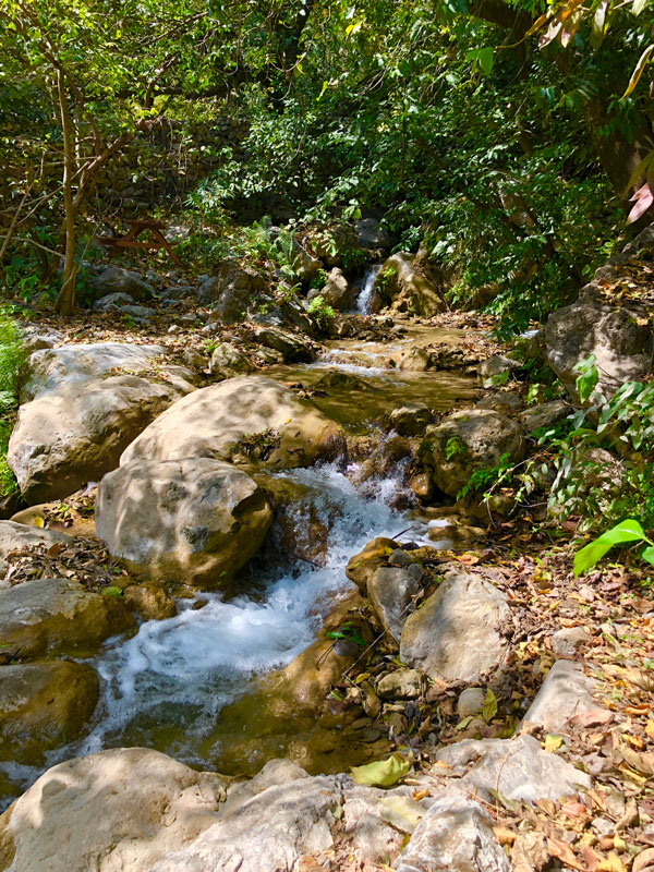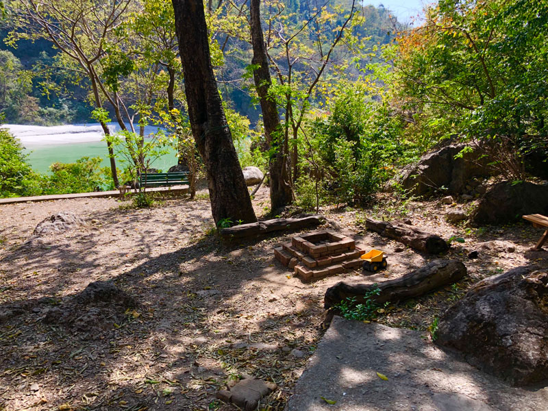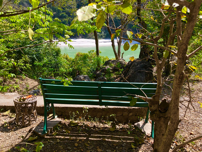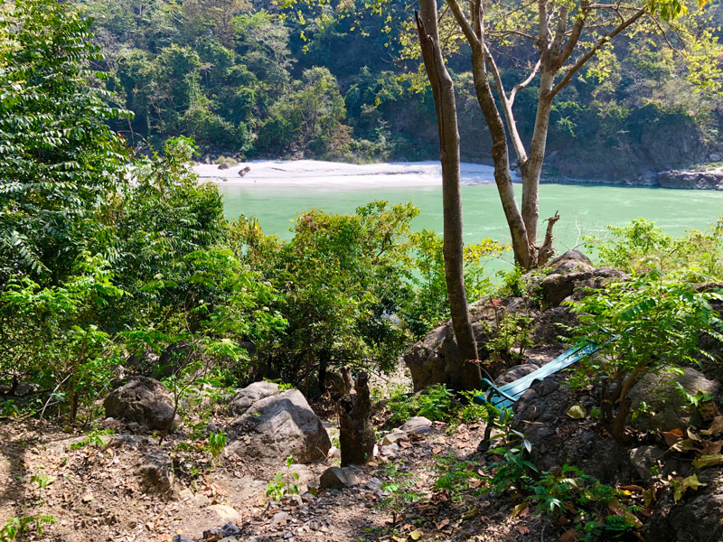 Accommodations are simple and lovely, with delicious vegetarian food, all set amidst breathtaking views directly on the Ma Ganga beach–an extraordinary and beautiful natural setting including a waterfall, fire pit, and easy access to the Ganga.